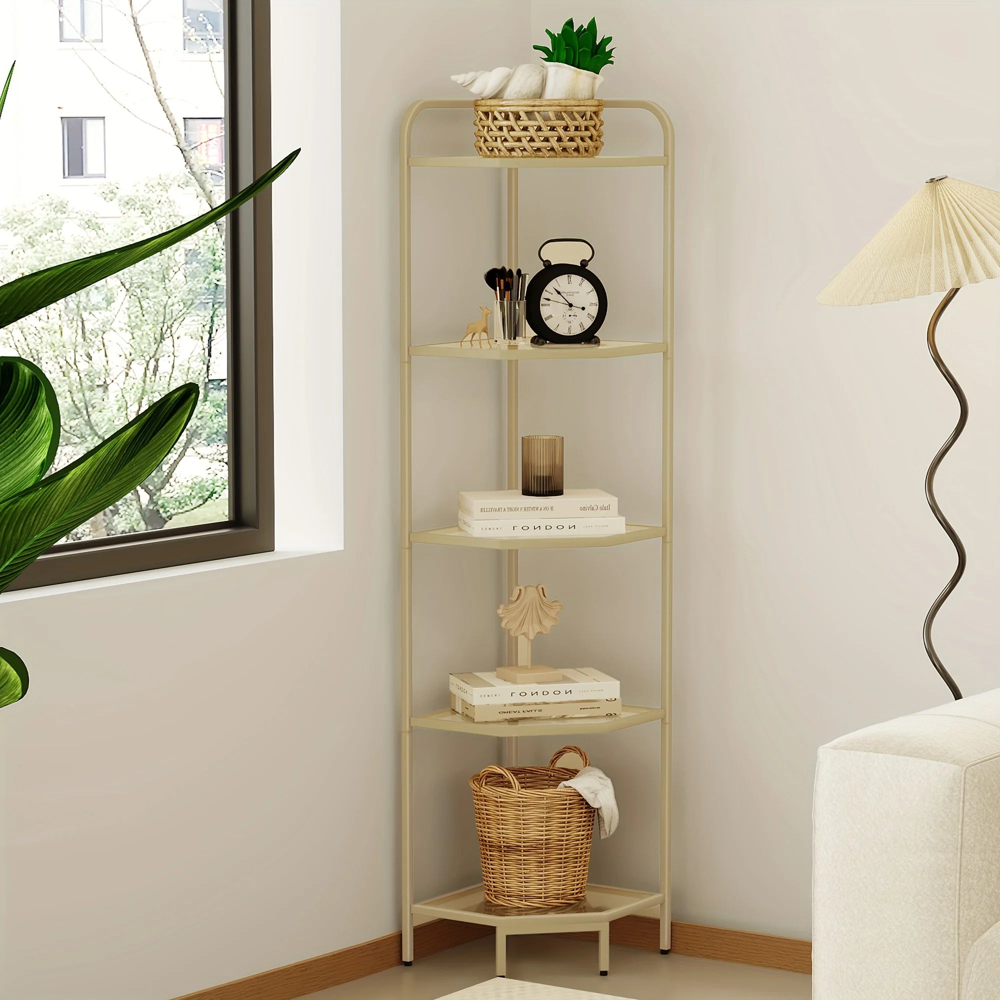 1. This elegant 5-tier corner shelf with a gold finish enhances the style of your living room or bedroom, offering plenty of storage and display space for books, photos, plants, and more. 2. In addition to being a practical storage solution for your living room, bedroom, entryway, and home office, this 5-tier corner shelf is versatile and can also be used in the bathroom to store toiletries, thanks to its rust-proof frame.