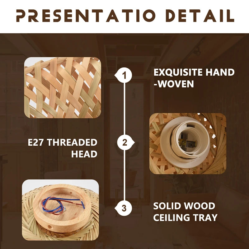 4. Composite style design and bamboo environmentally friendly materials, exquisite hand-woven, E27 threaded head, solid wood ceiling tray.