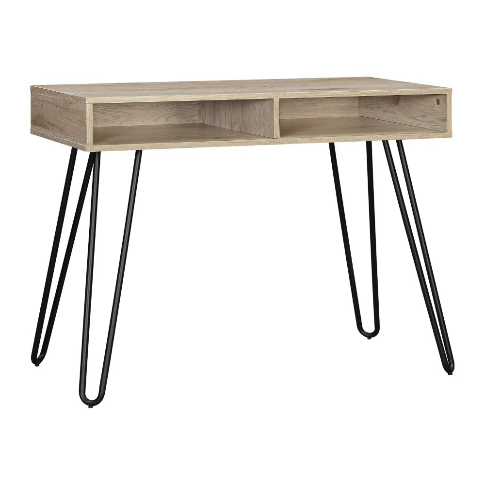Mid-century style meets modern design with the Hairpin Writing Desk. Four metal hairpin-style legs accent the clean lines of the open compartment desk and create an attractive minimalist look. The open compartment shelves are great for storing office accessories, supplies, writing utensils, or other items you wish to keep out of sight. A large open work surface has a multi-purpose design with enough space for working on projects, doing homework, laptop usage, and other home office activities. The simple, clean style pairs well with a variety of decors and office chair styles. With multiple color options available you can choose the right color combination to fit your look. The desk is constructed of a durable laminate that is built to withstand years of wear and tear. Whether an open home office or small apartment, the Hairpin Desk is the perfect fit for any room.