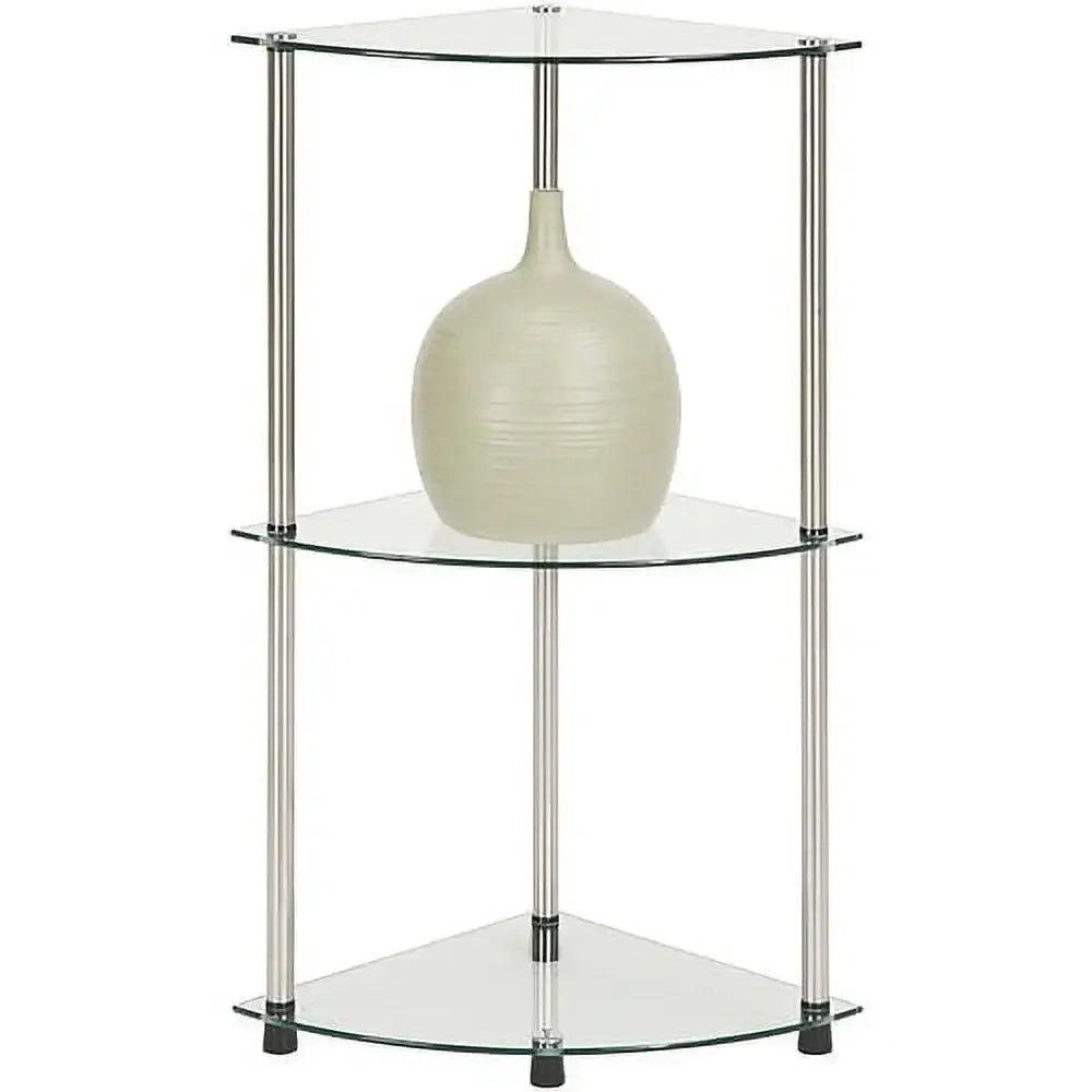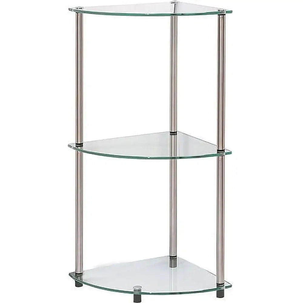 It allows you to utilize that unused corner space in your home while showing off so many of your favorite items. Place this glass bookcase in any room as a great combination of function and form. It is made with materials that are well suited to high-moisture environments for long-lasting durability. The polished tempered glass and stainless steel-clad poles will not warp or rust, so it is suitable for any area. Clean the glass shelving with any household glass cleaner for easy maintenance. The bookcase requires no tools and is simple to assemble so you can get it set up and ready to use right away. With a sleek style that easily matches with all types of home decor, the corner bookcase is a wonderful way to showcase your photos, trinkets and much more.